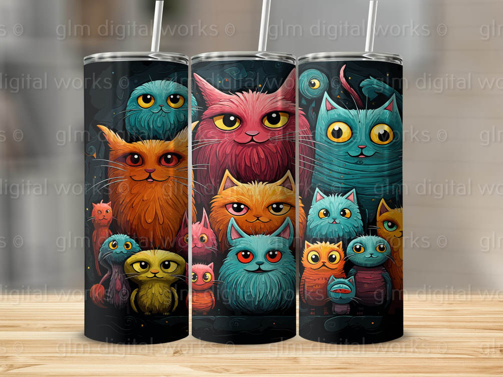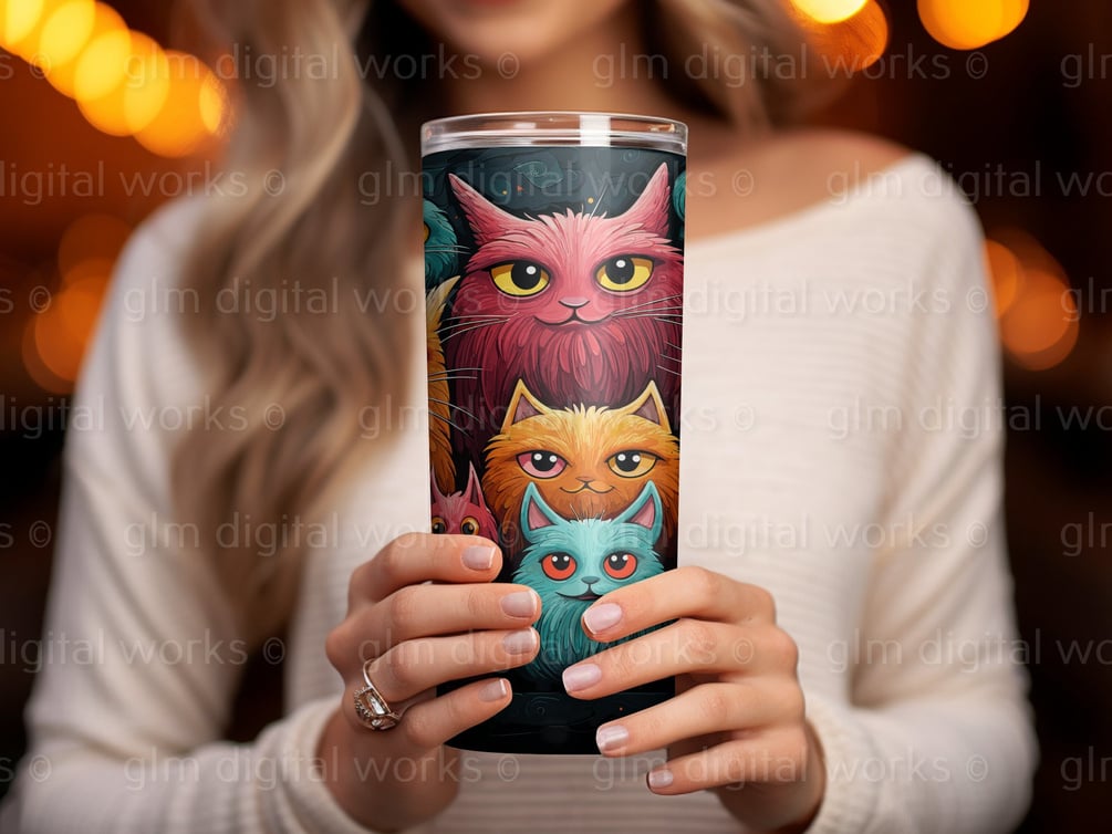This is your Cat Tumbler Wrap Design, which is a digital Art Print of colorful Sublimation for Tumbler, Mugs and more. This Digital Art Print shows cute and colorful Cats on a 20 oz Skinny Tumbler. Use it as Sublimination for different Purposes, Art Print on Pillows, Blankets, Curtains and many more in 300 DPI Resolution.